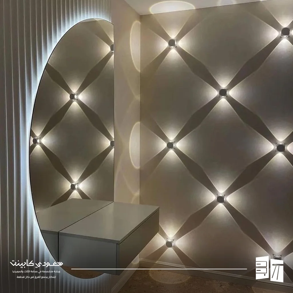 في سعودي كابينت، نولي اهتماماً خاصاً لتخطيط الإضاءة، سواء كانت طبيعية أو صناعية، ونستخدم تقنيات الإضاءة المخفية، المباشرة، وغير المباشرة لخلق جو ساحر. أما الألوان، فنختارها بعناية فائقة لتتناغم مع الأثاث والمواد، ولتعكس الهوية اللي تبغاها لاستقبالك.